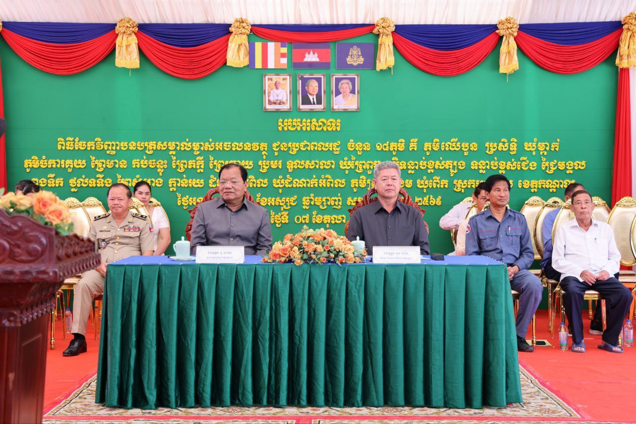 Kien Chamreun, Governor of Kandal Province, urged citizens to collect land title certificates distributed in the communes of Mkak, Prey Puoch, and Damnak Ampil, Angsnoul District. These distributions aim to enhance land security and resolve disputes, needing completion within 10 days. Chamreun highlighted the importance of continuous land registration for security and market stability.